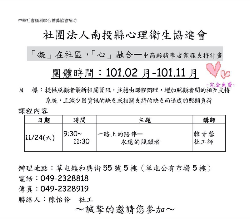 .版權所有:社團法人南投縣心理衛生協進會.瀏覽人數:581588E-mail:nato.cm1@msa.hinet.net .協會地址:(542)南投縣草屯鎮自由街96號 .聯絡電話:049-2328818.傳真電話: .IE7.0,Firefox.20以上版本.最佳螢幕解析度 1024x768 |隱私權宣告|資訊安全政策|